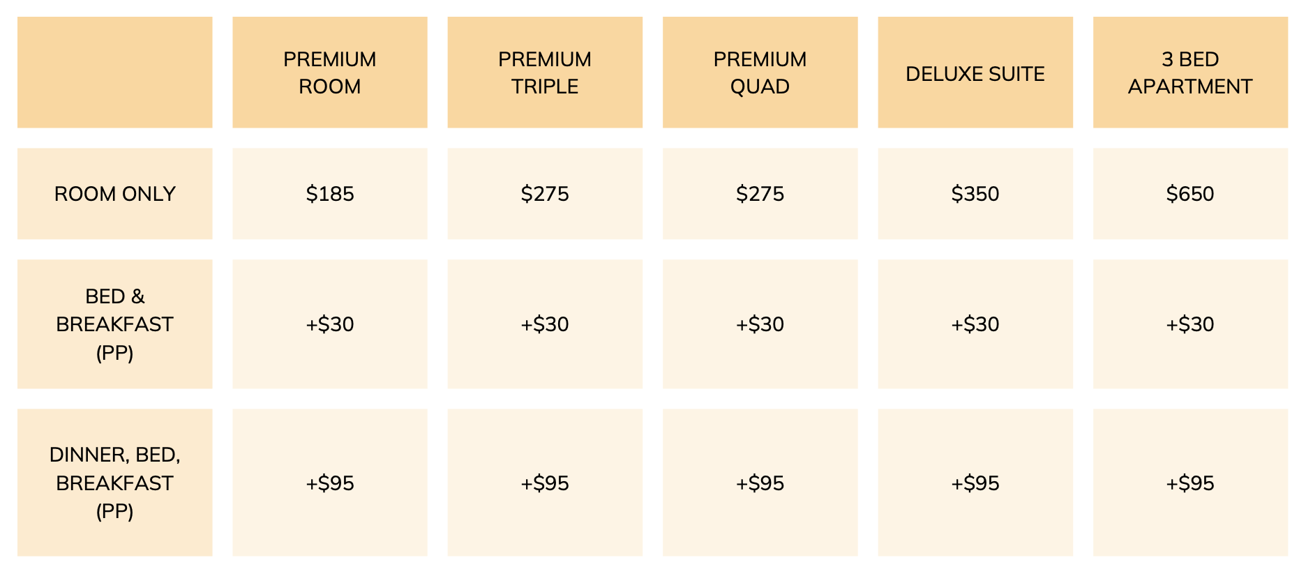 Book via email: reservations@rutherfordhotel.co.nz or phone: +643 548 2299
